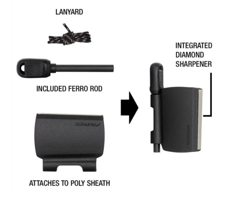 - Attached to the sheath comes a Survival Kit that has an integrated fire starter and a diamond sharpener